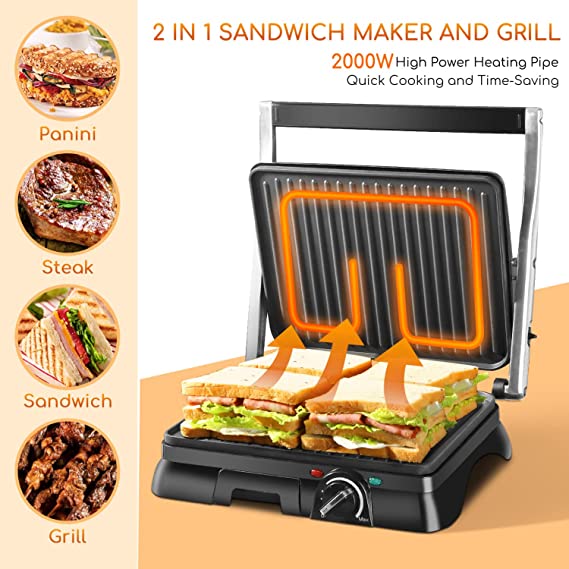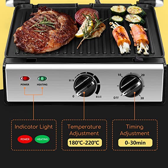 • 怐Grill with Control怑Set the toastie machine to a heat and timer which you want – easy to cook food to the perfect finish. 2000W high power heats up quickly in just 2 minutes. Ready-to-cook indicator makes sure the appliance is always hot enough to cook your sandwich right through. Superb grilling results with Aigostar powerful healthy grill.