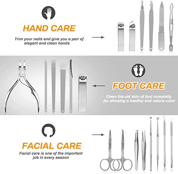 • 怐Multi-Purpose Manicure Set怑The 21 pcs manicure set includes toenail clipper, nail clipper, diagonal nail clipper, multi-purpose scissor, cuticle trimmer, ear pick, single-edged double-sided push stick, eyebrow tweezer, nail file, blackhead needle and loop remover etc, can meet your need for hand care, facial care and foot care. No need to pay for a single nail clippers or nose hair scissors, money can be saved.