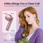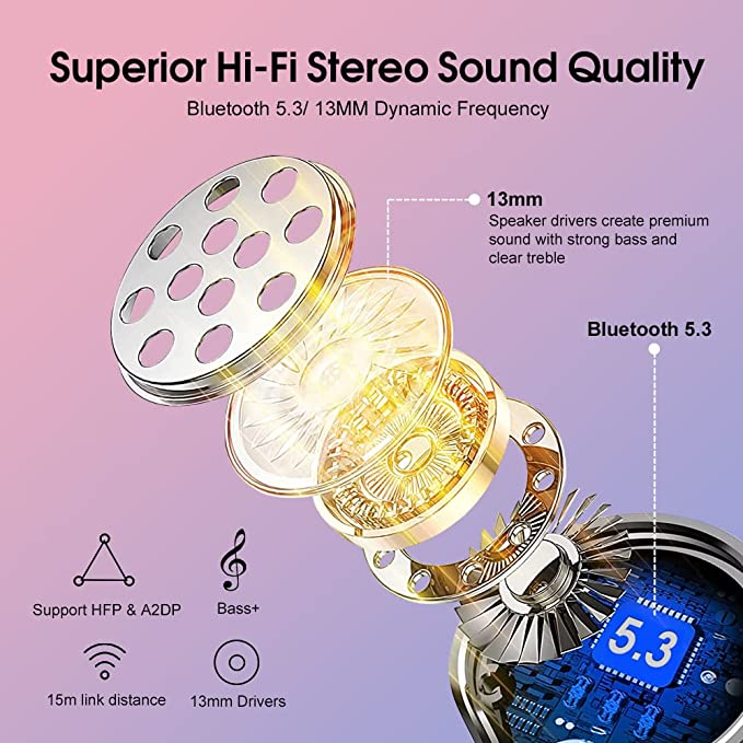 • Hi-Fi Stereo Sound and Crystal Clear Call: Bluetooth earbuds with 13mm vibrating diaphragm and AAC/SBC audio coding technology, resulting in sufficiently strong bass and naturally connects to the mid and high frequencies. True wireless earbuds adopts 4 mic design and ENC noise cancelling technology, can suppress 90% of the interfering background noise in the calling environment, allowing the other side to hear you more clearly.